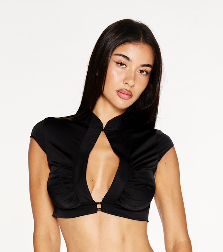 Meet Dara - a bold cropped top designed with a traditional collar that adds structure and elegance to the neckline. The deep front cut-out features soft gathers that shape the bust and create a sculpted, refined look. Confident, modern and full of attitude, this piece stands out on its own or layered into an evening outfit.
