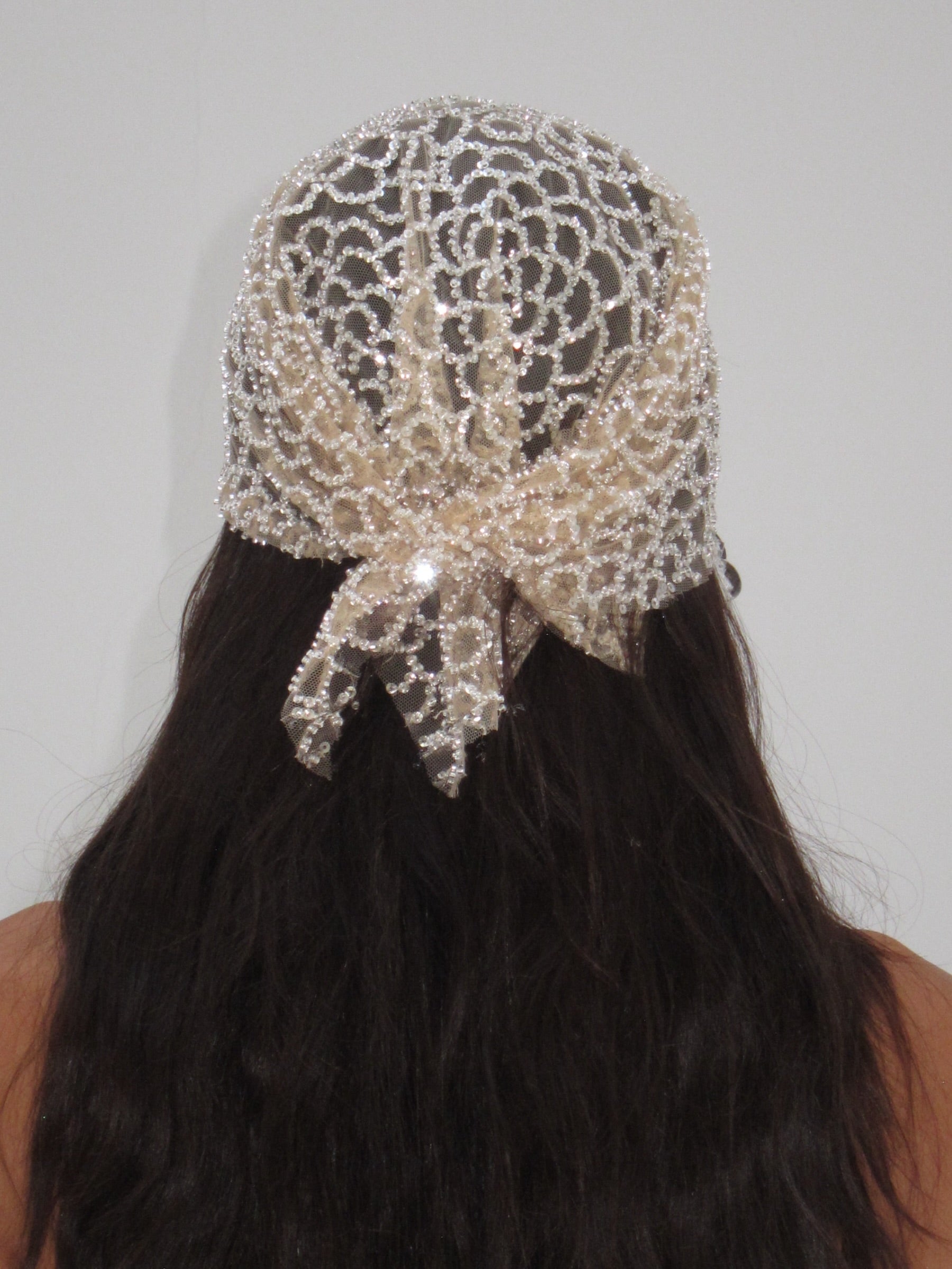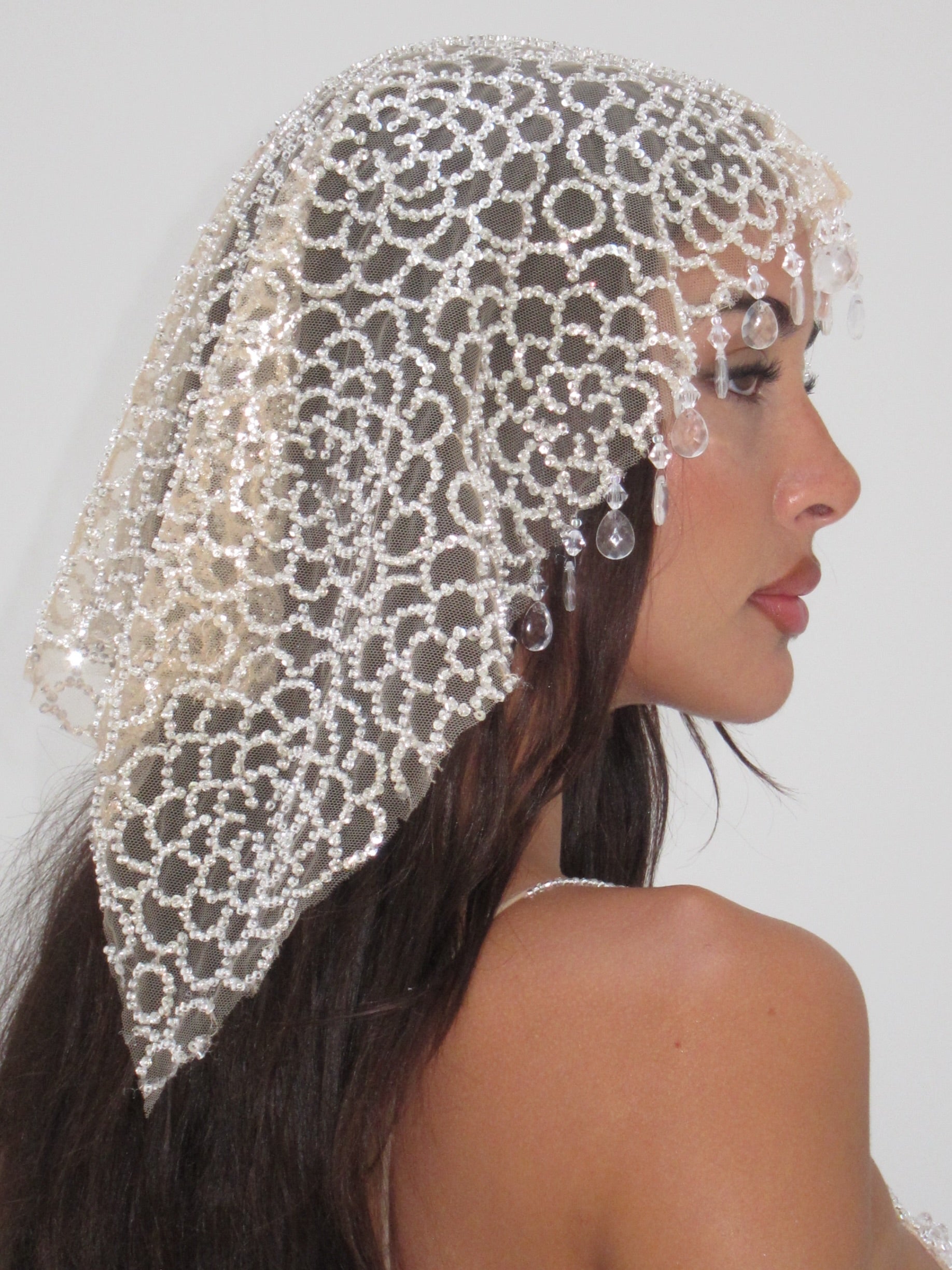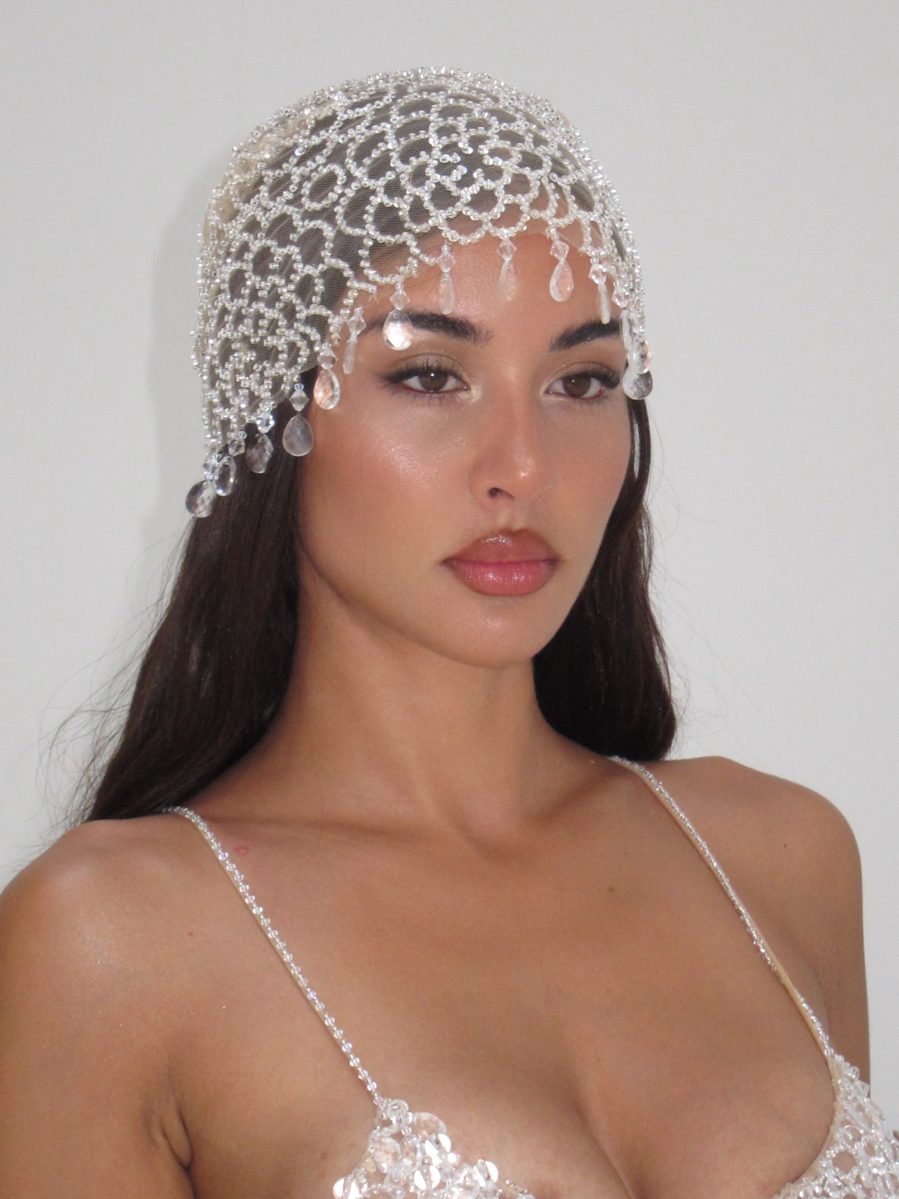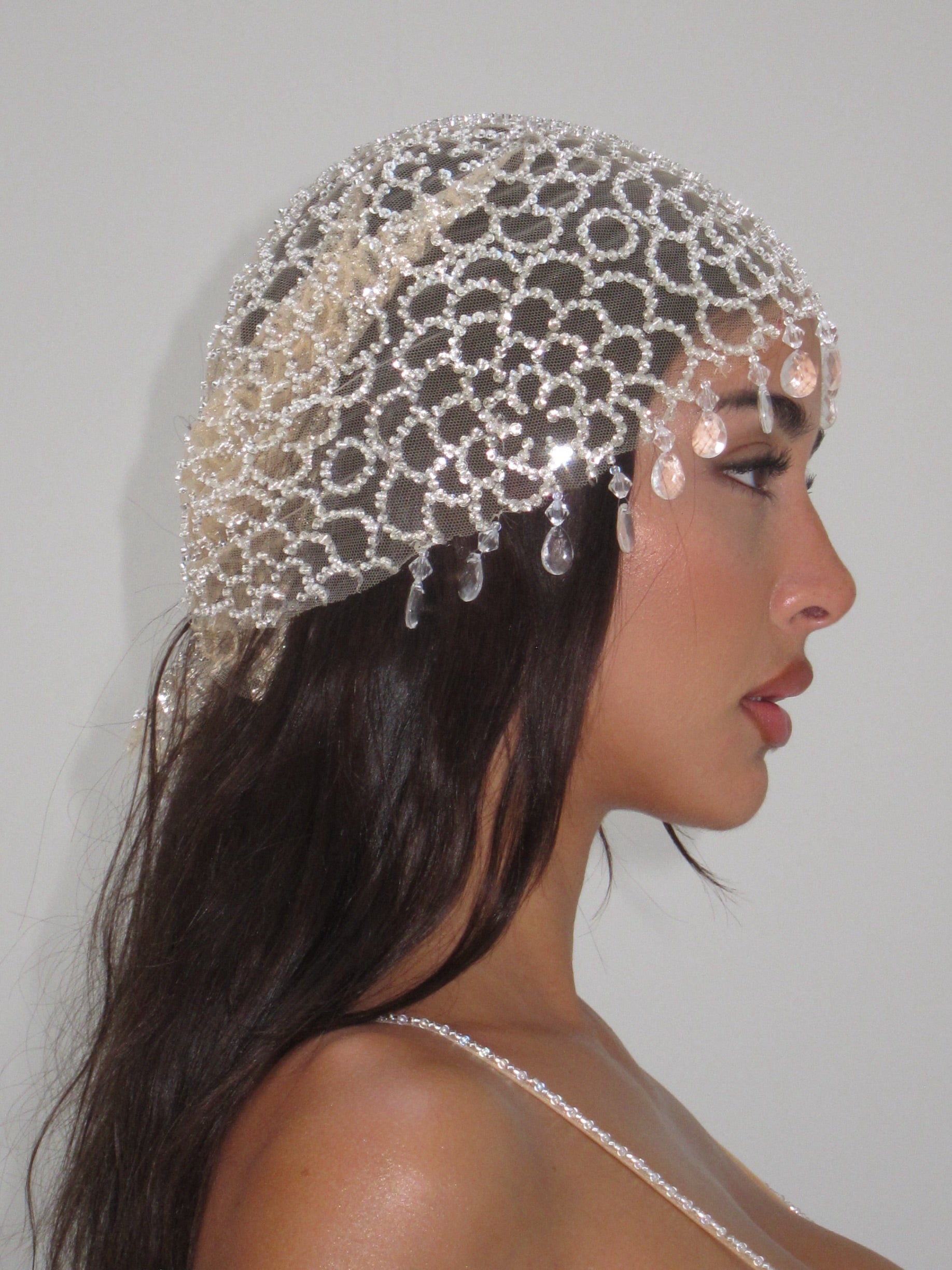 This handmade headband is crafted from delicate mesh and finished with hand-applied teardrop embellishments that fall softly around the face. Designed to frame the features with subtle movement, the piece catches the light like droplets of water at rest.