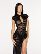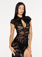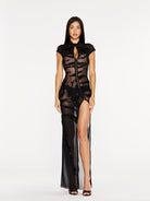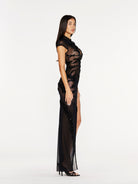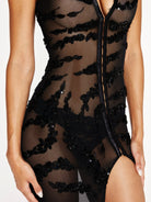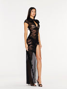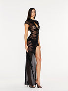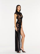 A show-stopping couture maxi dress crafted from ultra-soft sheer mesh that molds effortlessly to your silhouette. Custom embellished entirely by hand, each bead and appliqué is placed with precision to create a fluid, sculpted effect that catches the light with every move. The plunging front opening and high slit elongate the body, balancing sensuality with refined elegance.